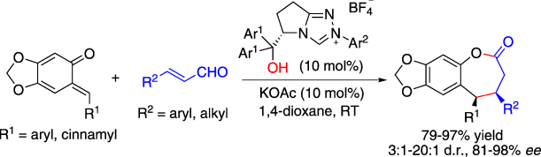 5. Hui Lv, Wen-Qiang Jia, Li-Hui Sun, Song Ye*. "N-Heterocyclic Carbene Catalyzed [4+3] Annulation of Enals and o-Quinone Methides: Highly Enantioselective Synthesis of Benzo-ε-Lactones." Angew. Chem. Int. Ed. 2013, 52, 8607–8610. PDF