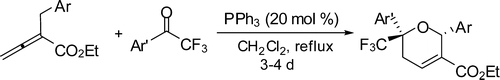 5. Tong Wang, Song Ye*."Diastereoselective Synthesis of 6-Trifluoromethyl-5,6-dihydropyrans via Phosphine-Catalyzed [4+2] Annulation of a-Benzylallenoates with Ketones." Org. Lett. 2010, 12, 4168-4171. PDF