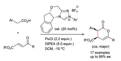 3."N-heterocyclic carbene-catalyzed cyclocondensation of 2-aryl carboxylic acids and enones: highly enantioselective synthesis of δ-lactones" Jin-Tang Cheng, Xiang-Yu Chen and Song Ye. Org. Biomol. Chem., 2015, 13, 1313–1316. pdf