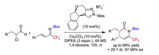 4."Enantioselective N‑Heterocyclic Carbene-Catalyzed Synthesis of Trifluoromethyldihydropyridinones" Dong-Ling Wang,Zhi-Qin Liang,Kun-Quan Chen, De-Qun Sun, and Song Ye. J. Org. Chem. 2015, 80, 5900−5905. pdf