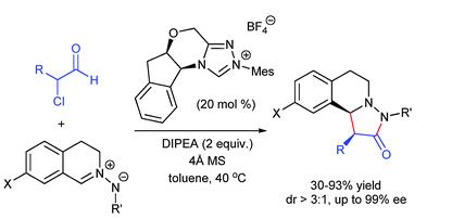 6."N-Heterocyclic carbene-catalyzed [2+3] cyclocondensation of a-chloroaldehydes with azomethine imines" Zhong-Hua Gao, Xiang-Yu Chen, Jin-Tang Cheng, Wei-Lin Liao and Song Ye. Chem. Commun., 2015, 51, 9328--9331. pdf