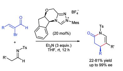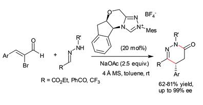 8."N-Heterocyclic carbene-catalyzed [3 + 3] cyclocondensation of bromoenals with hydrazones: highly enantioselective synthesis of dihydropyridazones" Chun-Lin Zhang, Dong-Ling Wang, Kun-Quan Chen and Song Ye. Org. Biomol. Chem., 2015, 13, 11255–11262. pdf