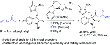 8. "N-Heterocyclic carbene-catalyzed β-addition of enals to 3-alkylenyloxindoles: synthesis of oxindoles with all-carbon quaternary stereocenters" Chun-Lin Zhang, You-Feng Han, Song Ye* Chem. Commun. 2019, 55, 7966.